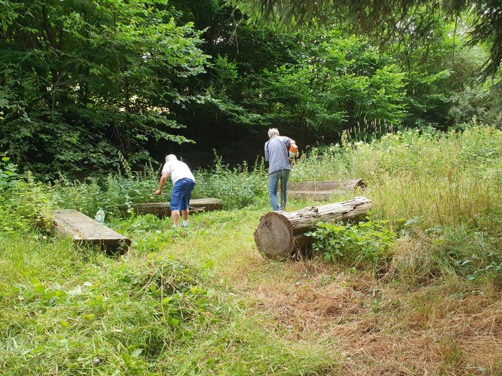 Pflege des gepachteten Grundstücks gegenüber der Teichanlage (s. Fotos) Zurückdrängen der Brombeeren, Freischneiden des kleinen Wasserlaufs bzw der gesamten Anlage, damit Wanderer weiterhin den als Glücksort geschaffenen zum Verweilen nutzen können.