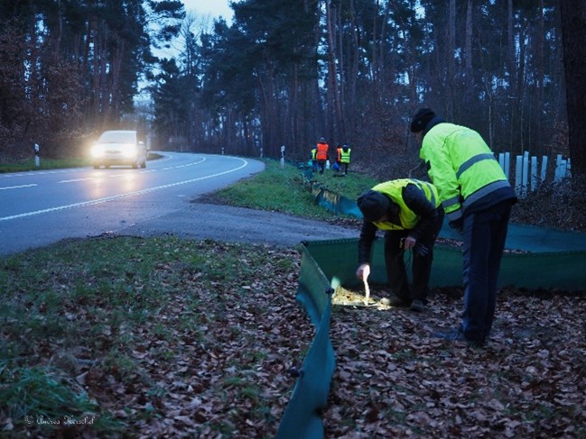 Das wollen wir mit dieser Schutzmaßnahme Zäune / Absammlung erreichen! Den Schutz der Tiere! Die Schutzzäune müssen morgens und abends abgelaufen werden, die Sammeleimer inspiziert und die Tiere herausgenommen werden – und über die Straße in Gewässernähe gebracht werden. Wir errichten auch die temporären Schutzzäune (diese grünen Zäune an den Straßen), was viel Arbeit ist – und suchen jedes Jahr auch hier Unterstützung! Die Termine werden immer im Terminkalender veröffentlich. An manchen Einsatzorten gehen wir auch Teile der Straßenbereiche ab.